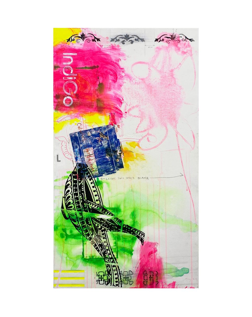 Graphite, acrylic, pastel, paper collage and oil on canvas