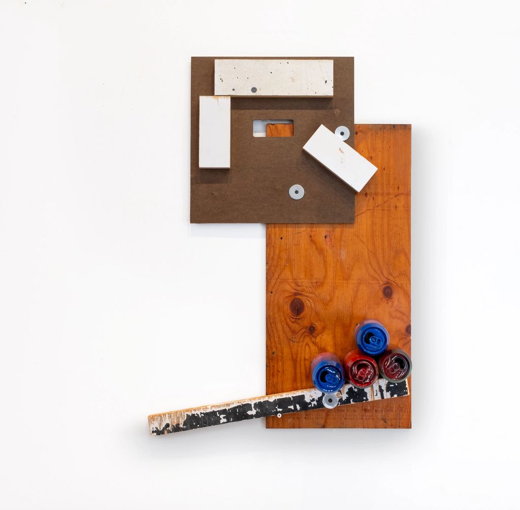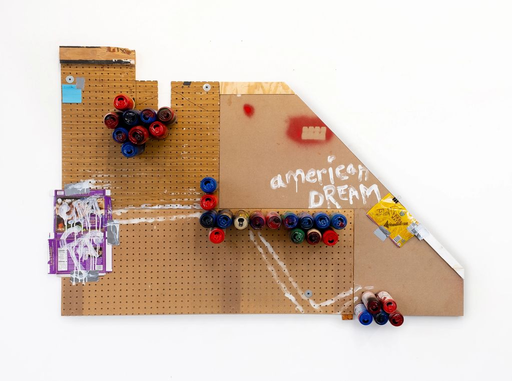 Acrylic, graphite, duct tape, food package, recyclable aluminum and steel cans, on pegboard and wood