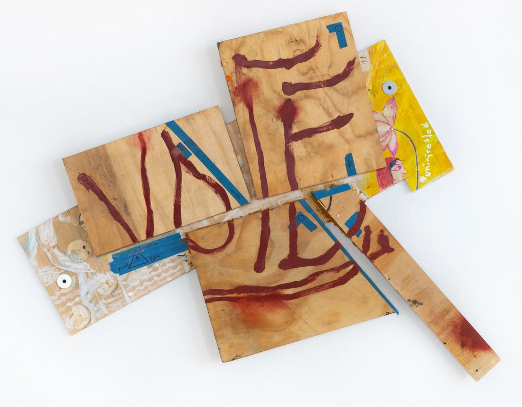 Enamel, wood primer, acrylic, graphite, ink on found wood